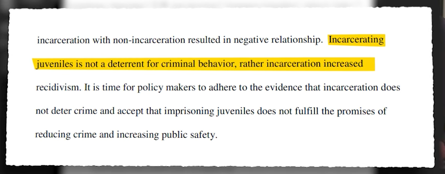 He says that moral outrage, righteous revenge, and vindictiveness is irrelevant to what that actual goal is: keeping people from committing these crimes. So when we look at the evidence, we find that "younger adolescents have higher probabilities of further incarceration after entry into the criminal justice system."
